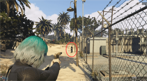 之后清理码头附近的敌人,有一个单个站岗的,两个面对面站岗的,都打掉就可以了。面对面站岗的可以调整位置,让俩人的头在一条直线上,连开两枪打掉,容错率较高(多开一两枪也不会被发现)。