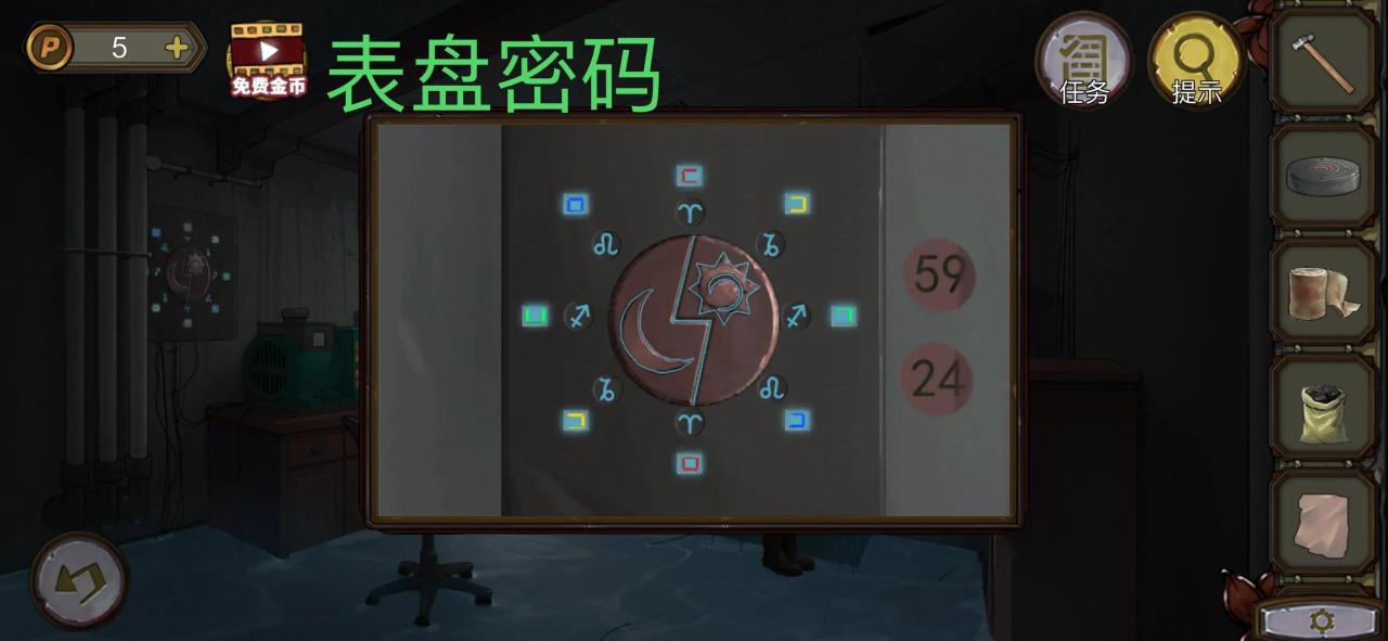2.光源往右侧移动点击柜子获得钥匙,点击煤炭获得阀门。根据柜子旁图案获得动物对应数字密码为3749打开旁边的笼子获得手套。
