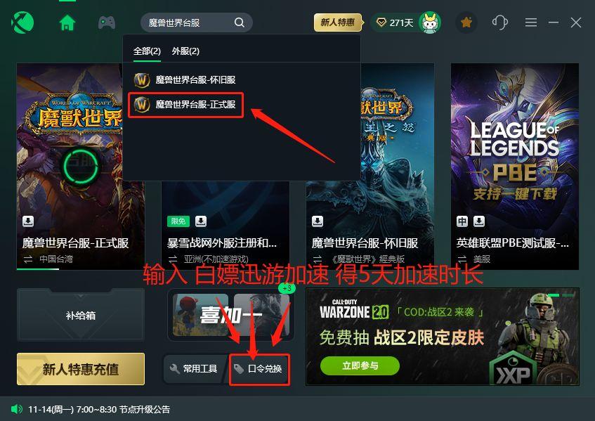 1.打开迅游加速器,搜索魔兽世界台服之后进行加速即可,没有时长的小伙伴输入白嫖迅游加速,就能够获得5天的加速时长;