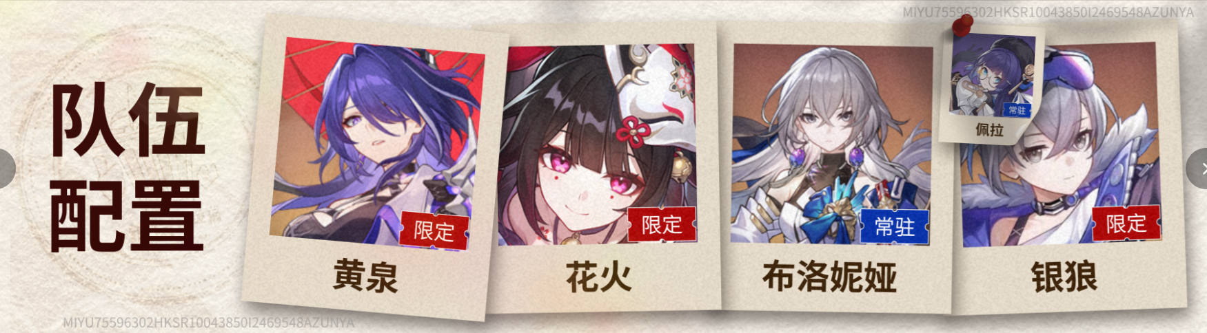 黄泉的机制使得黄泉的队伍比较固定,至少是需要有一位虚无队友进队,其他队友以能够高频率施加负面效果的角色最佳。