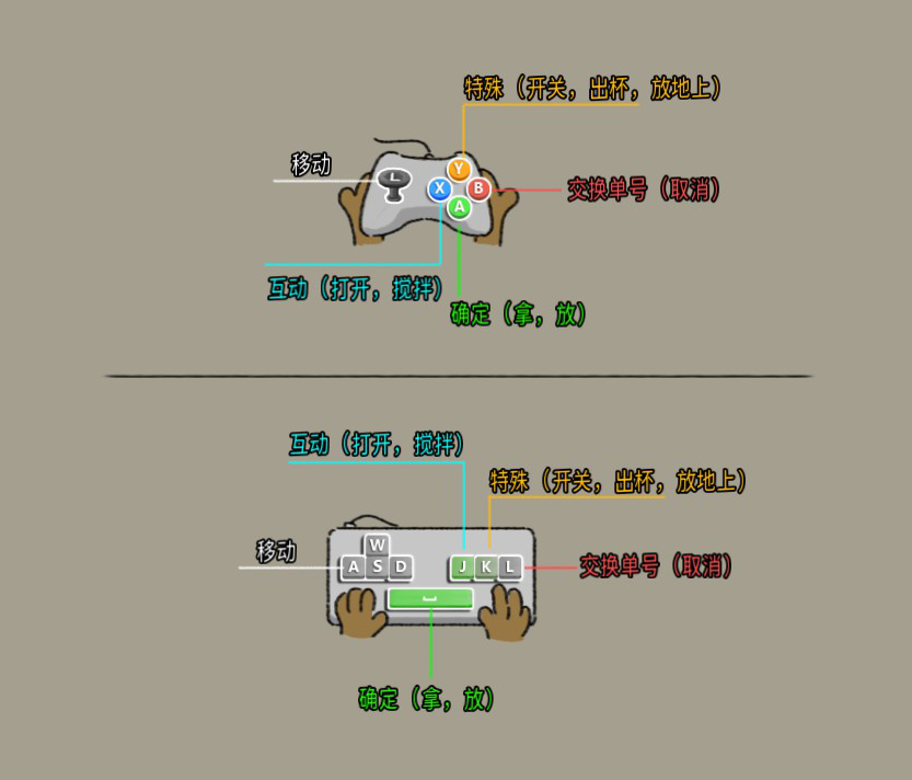 Y键功能为特殊操作(开启关闭制冰机、蒸汽机等机器,出杯,把手上物品放到地上)。