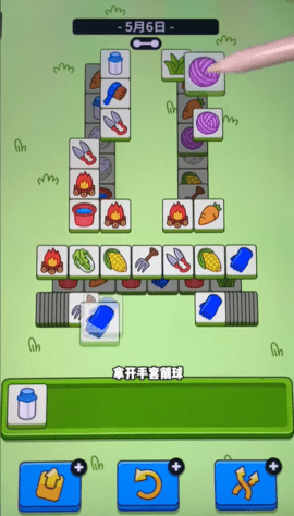 2、刚开局盲盒先隔开两张,奶瓶3个,羊毛开一个,拿开白菜消水桶,然后按照叉子,剪刀,紫球,铃铛,羊毛,刷子,小草顺序消除。