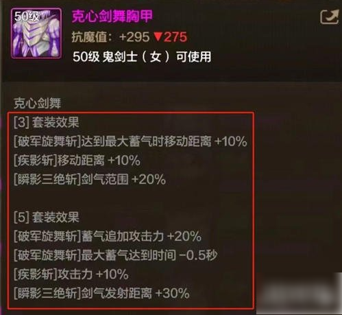 接着,我们再来看看第二套克心剑舞。这套装备主要是强化疾影斩、破军旋舞斩还有三绝斩这几个技能,能够大幅度地提高技能的攻击距离和范围,而且还能缩短旋舞斩的蓄力时间。因此,如果你是为了搬砖而选择装备的话,那么克心剑舞绝对是你的首选哦!