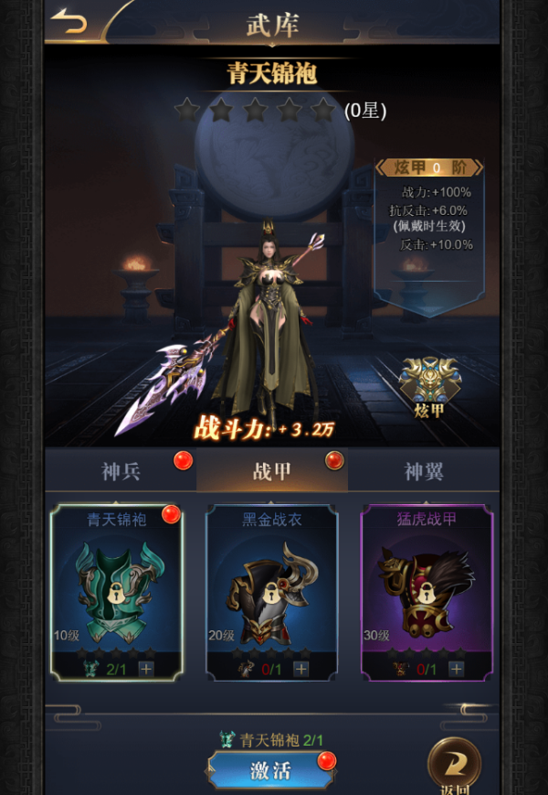 武库主要包含三大部分:神兵、战甲、神翼,品质从低到高为:绿、蓝、紫、橙、红。想要获得神兵战甲神翼可以参与大型多人副本获得,尤其是势力首领、青龙偃月等多人活动,其他就是关注游戏不定期的运营活动,也有机会获得。激活神兵、战甲或神翼后,选中该装备可以点击左下方的“佩戴”,就可以让人物外观发生变化,穿上选中的装备啦!