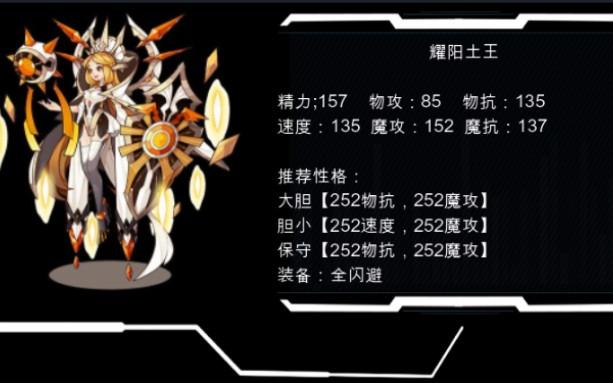 耀阳土王是很多平民玩家喜欢的一只宠物,太阳妹妹是实力也是非常强大的,可以硬刚王国里面所有宠物。满防御的土妹是可以单挑打赢破晓的。推荐性格:大胆(加满防御和魔攻)适合针对破晓、胆小(加满速度和魔攻)适合内战。