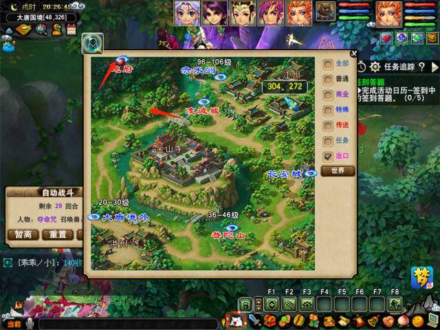 长安领完双倍有三倍领三倍,在长安278,42的位置传送国境去地府,长安合成旗基本都能飞到,然后打开地图去地府找钟道(47.55)领任务。