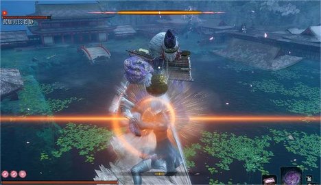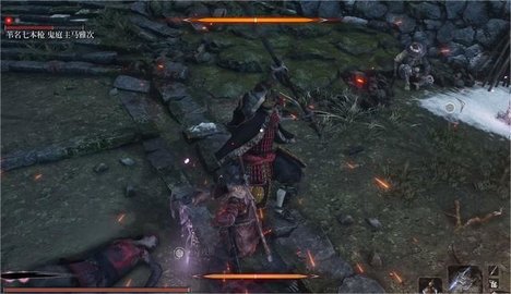 进入平田宅邸区域之后在【宅邸街】沿着小路走,你会看到一个拿着火把的敌人以及两个举着盾牌的敌人(用斧子可以破盾),后面有一座桥。过桥往前走到花园就可以看到小BOSS【忍者猎人 弥山院圆真】了。可以先把附近的小怪清光,然后脱离BOSS视野,靠近灌木丛的时候抓住机会直接秒掉他的一管血。